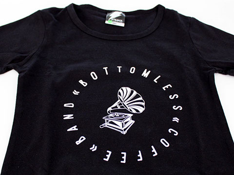 Now anyone can now wear Bottomless Coffee Band's sleek, clean cut t-shirts. The band went with two screens to keep a consistent design proportion to the t-shirt.