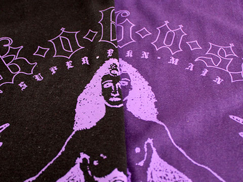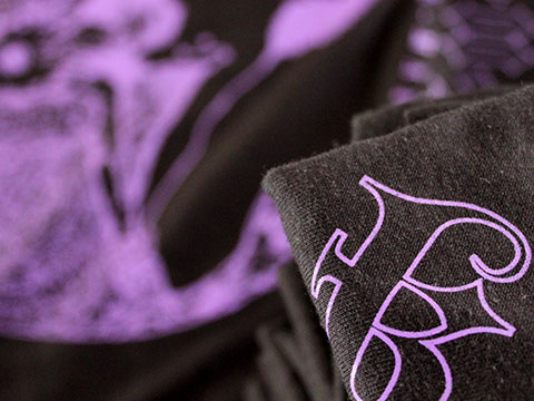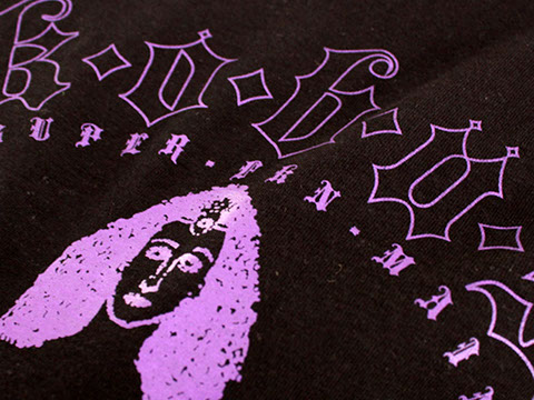 Such a rad t-shirt! Permanent Record got us doing this for K.O.B.U.S and it came out so dope! Permanent record wanted custom plastisol purple on purple and black t-shirts.