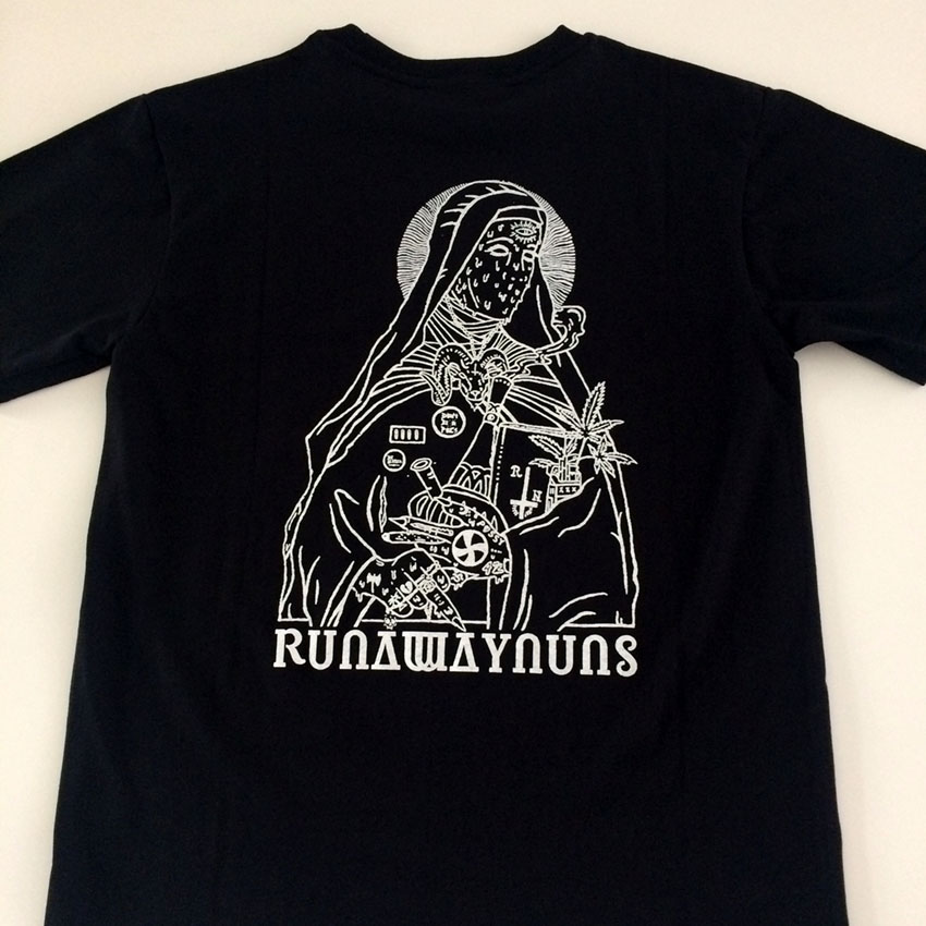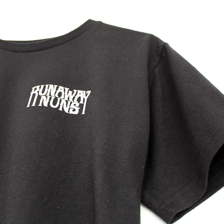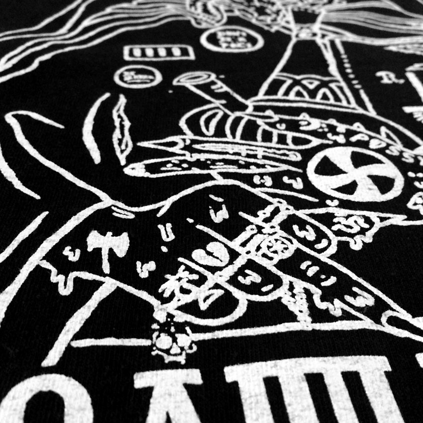 This sick design was printed with plastisol on our standard crew neck t-shirts. Black t-shirts with a large white print on the back and the band name