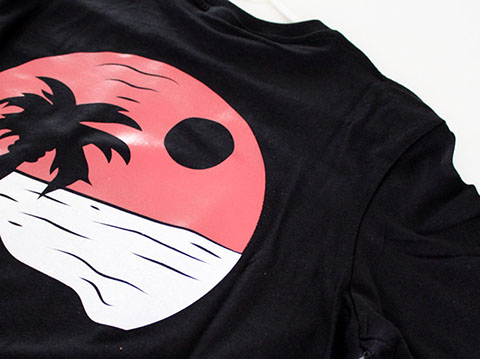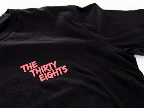 We printed solid white and custom orange plastisol on fitted crew neck t-shirts. Two screen setup for a large print on the back and cleanly registered band name type on the heart.
